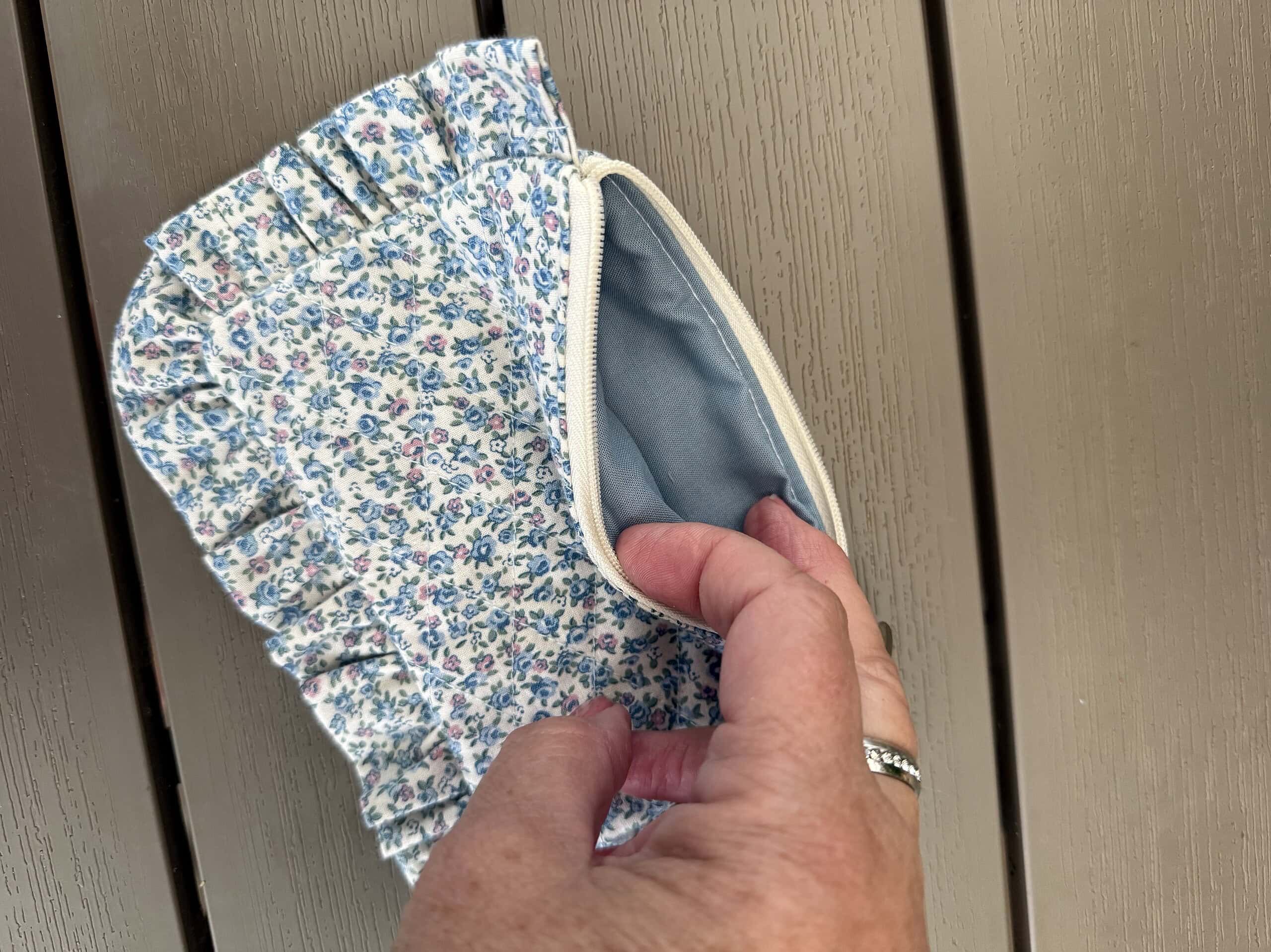 Sötaste börsen med volang , sydd av små tygrester från annan sömmerska.