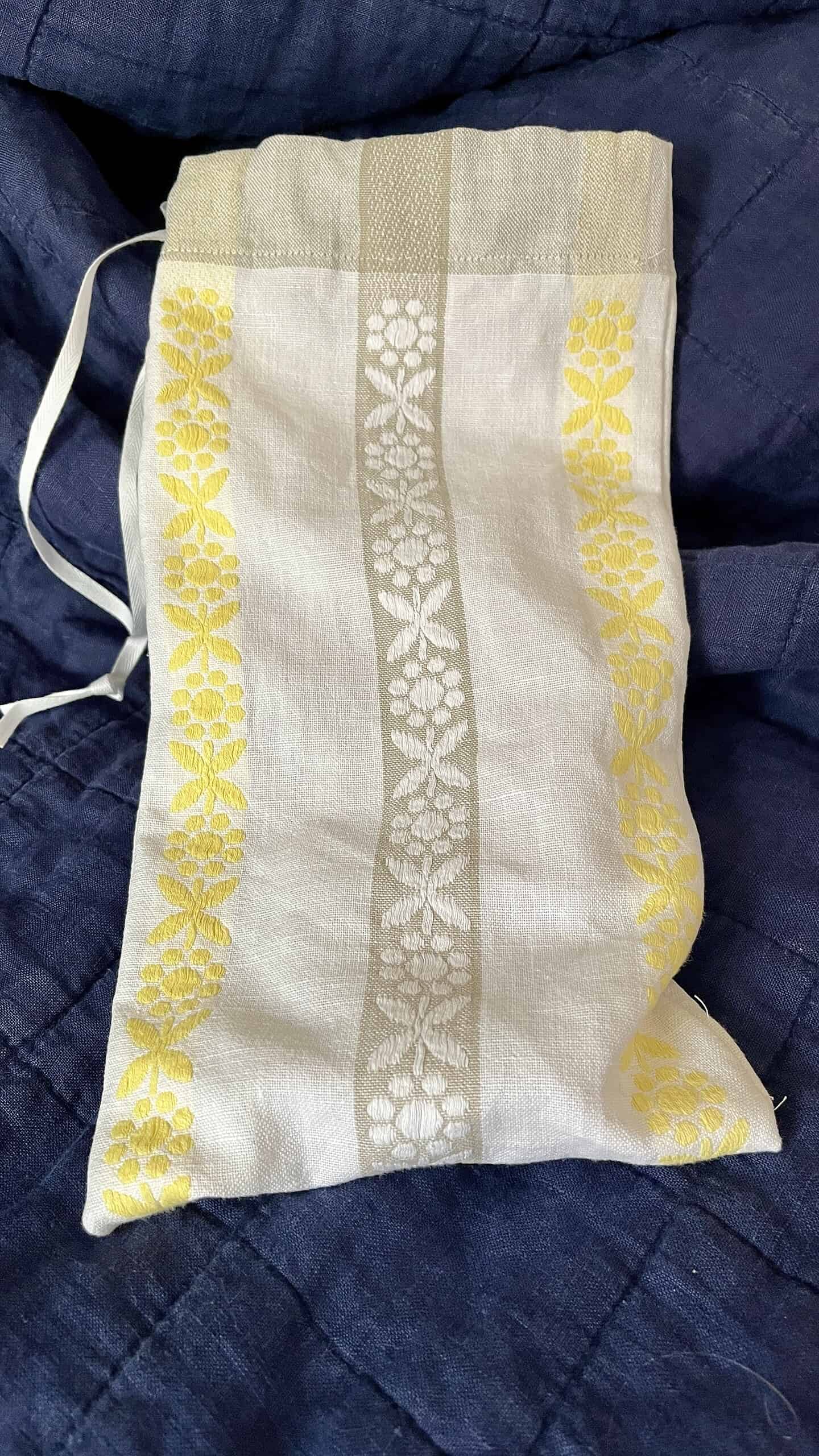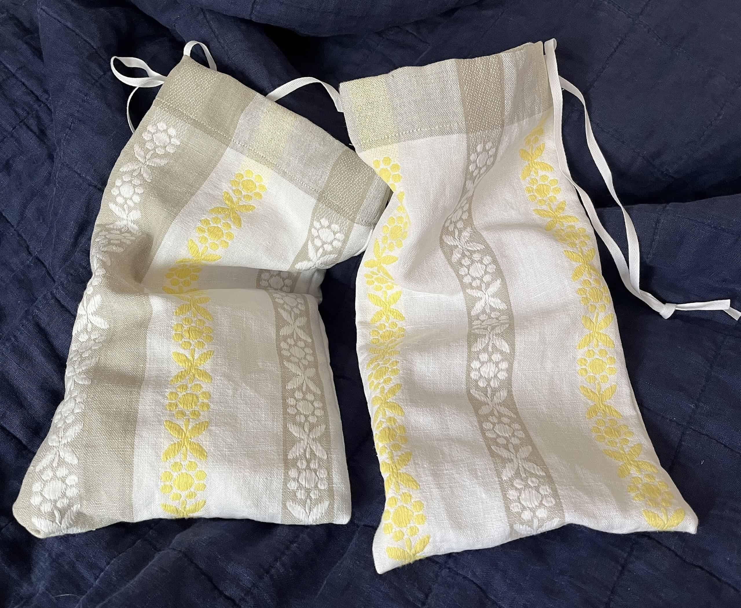 Påsen är sydd av mjukt och lite tjockare tyg i lin med eventuellt inblandning av bomull. De små passar fint för att hålla ordning på laddsladden eller ett par små inneskor.