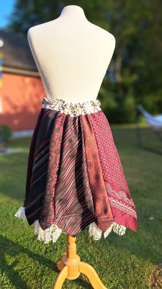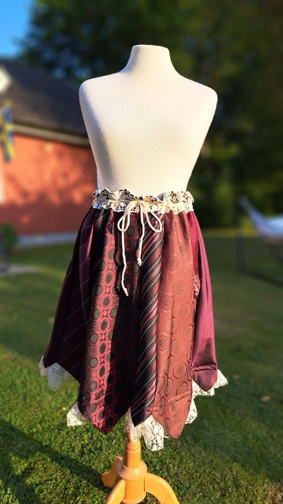 En kjol som sticker ut med sitt unika hantverk och personliga uttryck. Den är omsorgsfullt skapad av återbrukade slipsar, mjuka spetsgardiner och vintagespets – ett plagg där varje detalj bär på en historia.