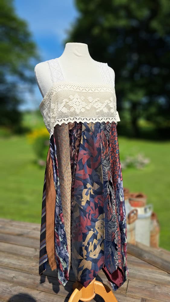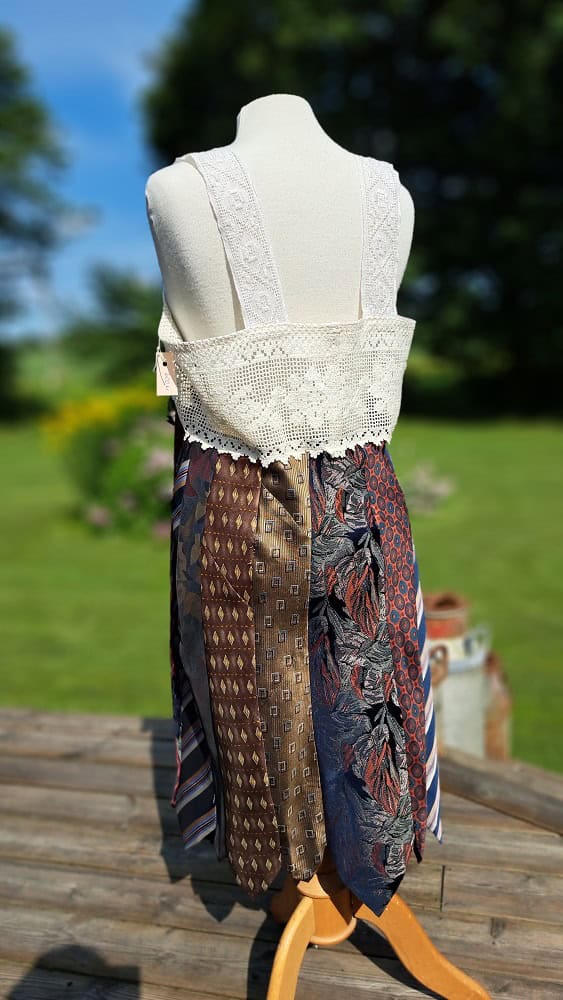 Varje klänning är handsydd och helt unik – ingen är den andra lik. Mönstren och färgnyanserna från slipsarna gör varje plagg till ett original.