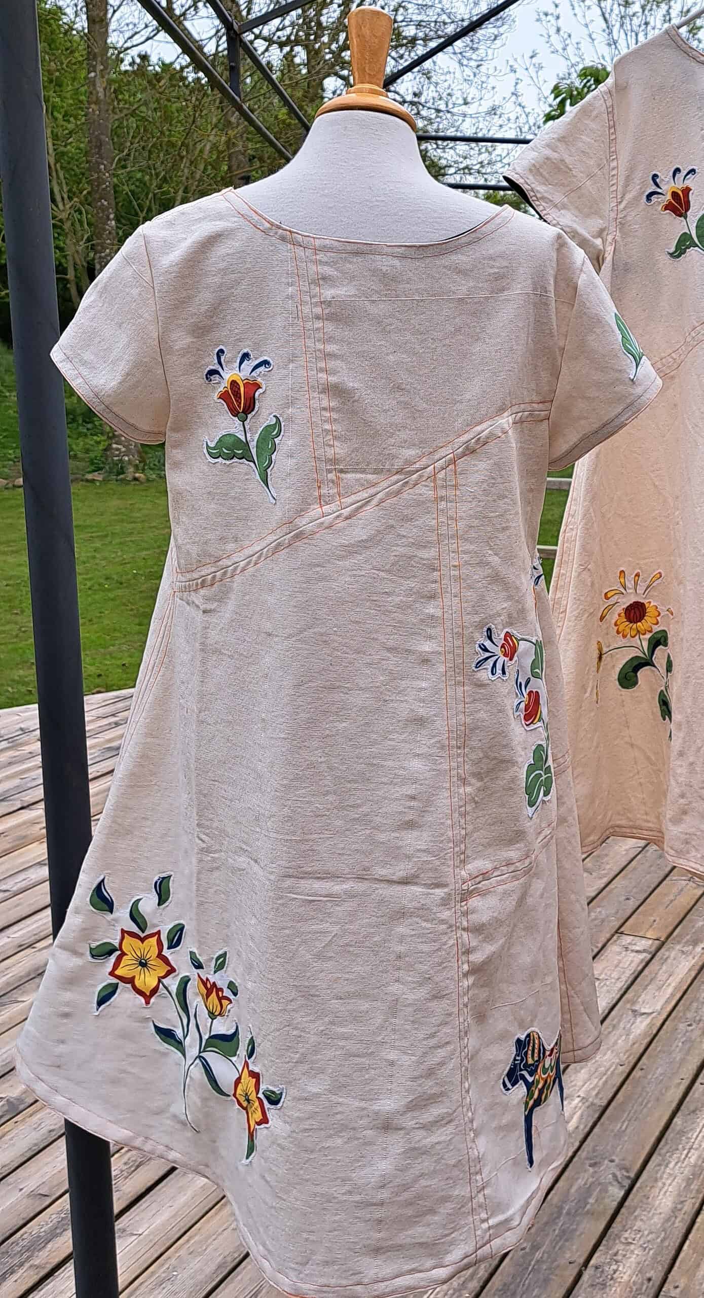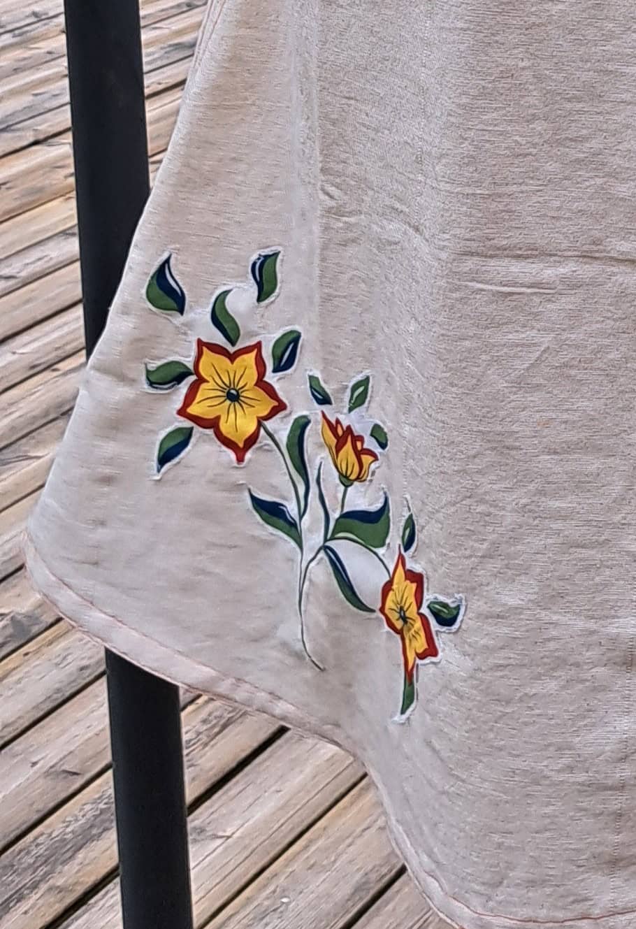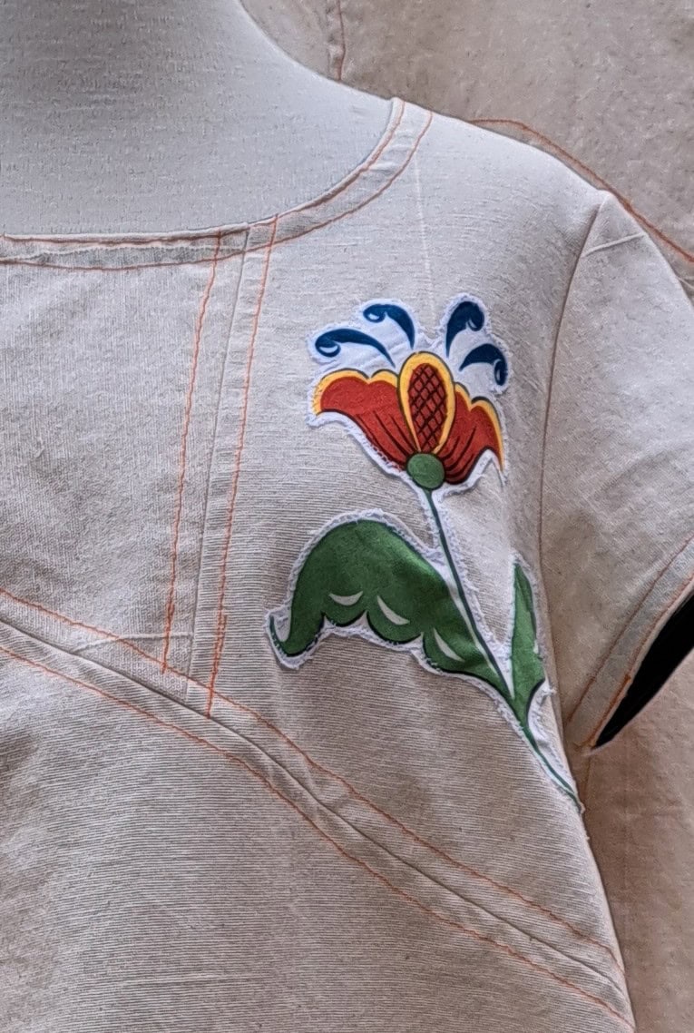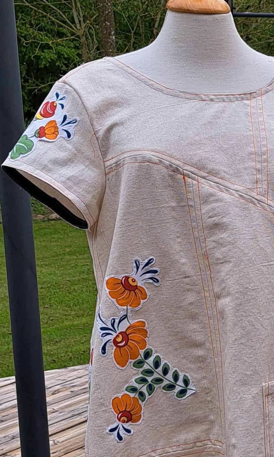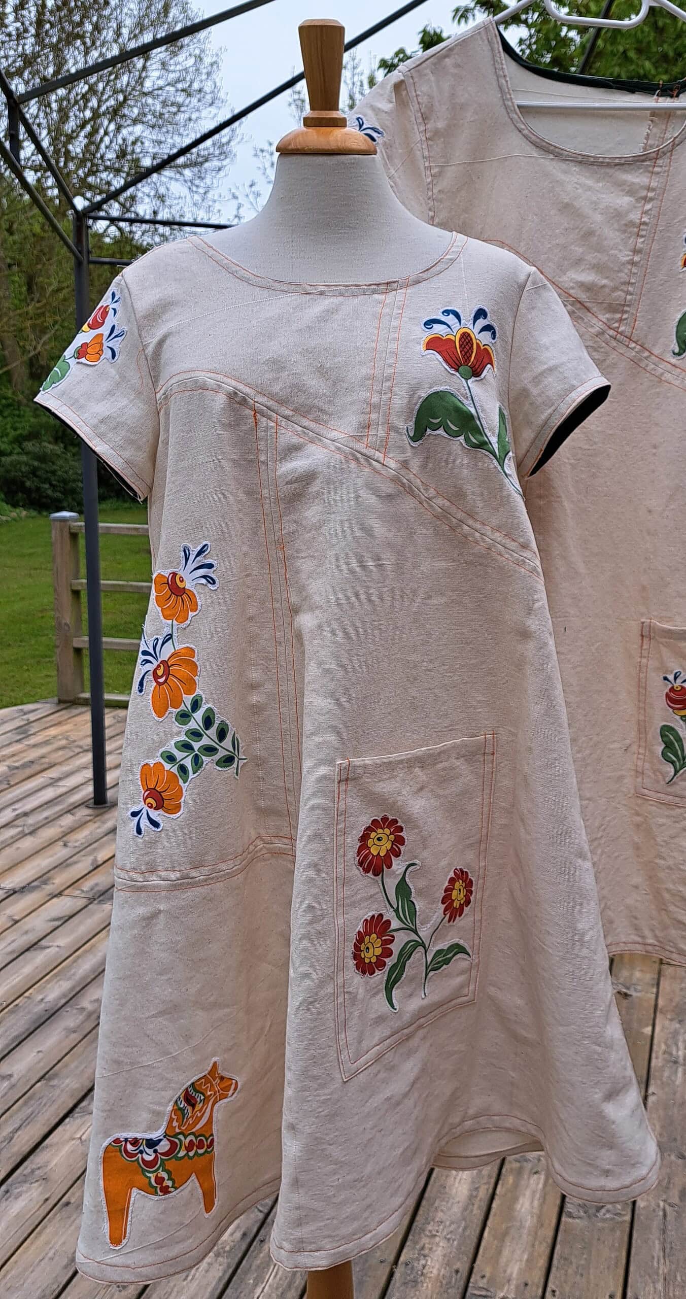 Denna klänning är skapad av återbrukade bomullsgardiner och bär på en berättelse om hantverk, hållbarhet och svenskt kulturarv. Med applikationer av dalahästar – en av våra mest älskade svenska symboler – och traditionella blomsterdetaljer blir klänningen både lekfull och tidlös.