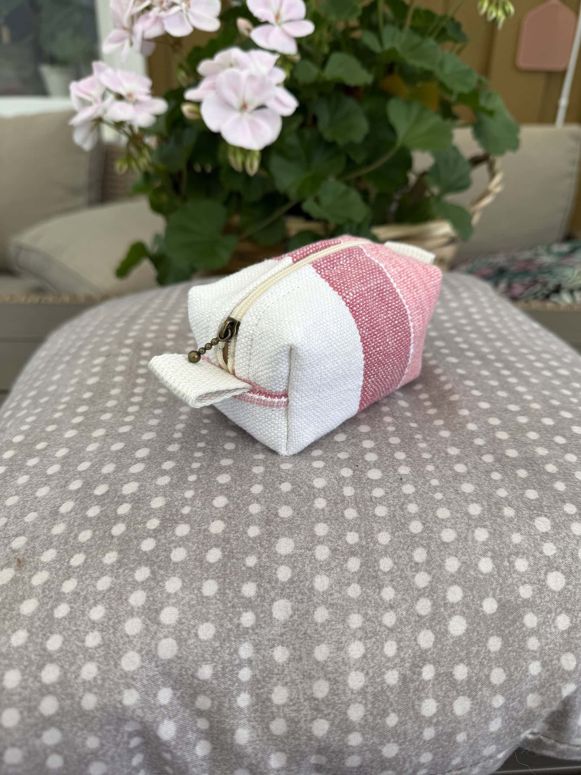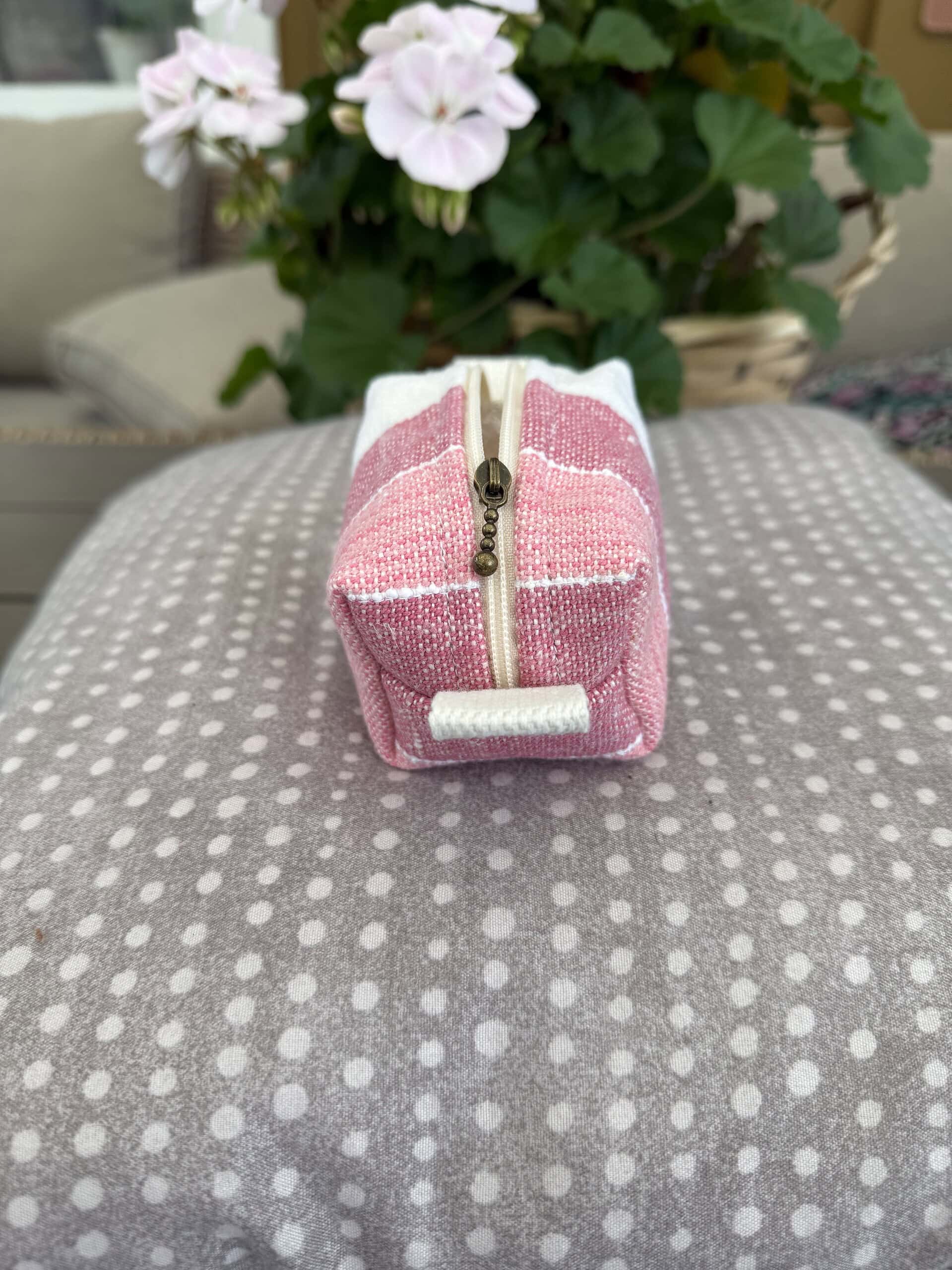 Unik necessär sydd av återbrukad löpare (hemvävd duk) .