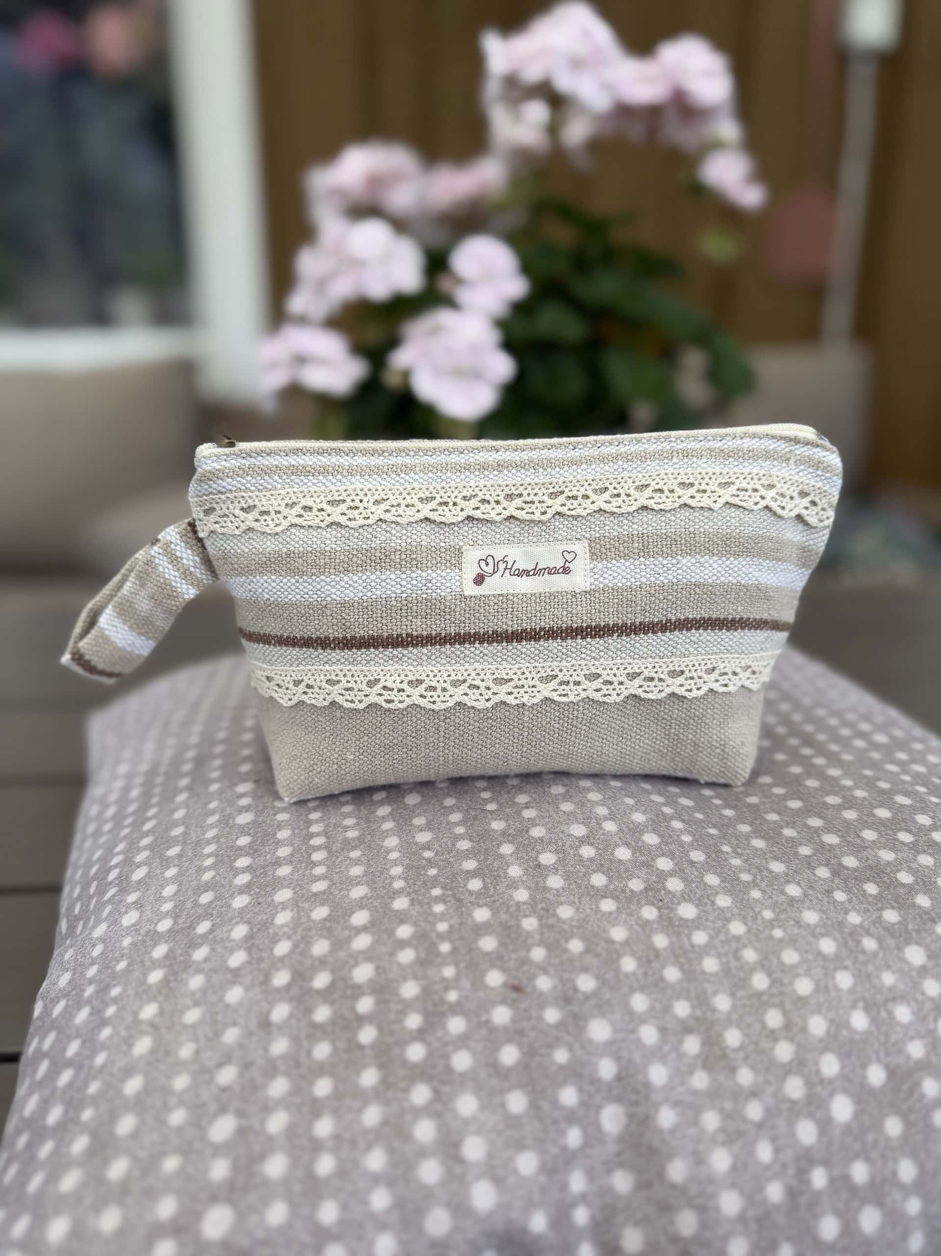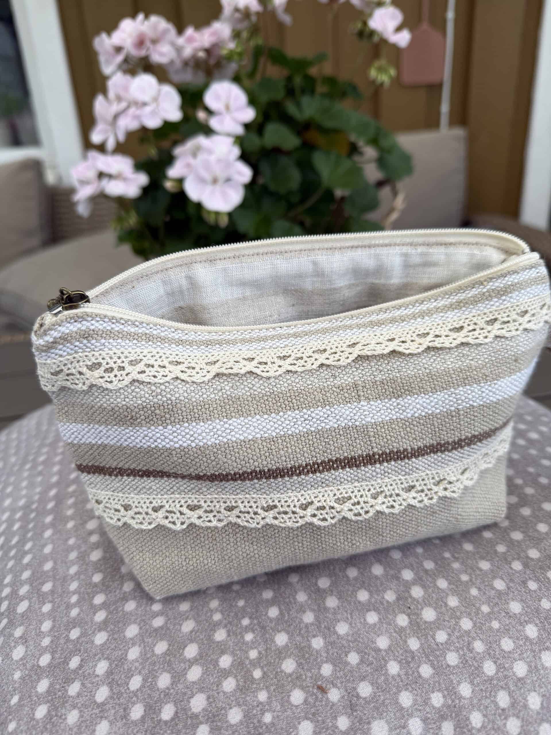 Unik necessär sydd av återbrukad löpare (hemvävd duk), även spetsen är köpt på secondhand